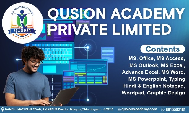 Qusion Academy Private Limited Is A Professionally Managed, Government-Registered Computer Education Institute Located At Bandhi Marwahi Road, Amarpur, Pendra, Bilaspur (Chhattisgarh) – 495119.